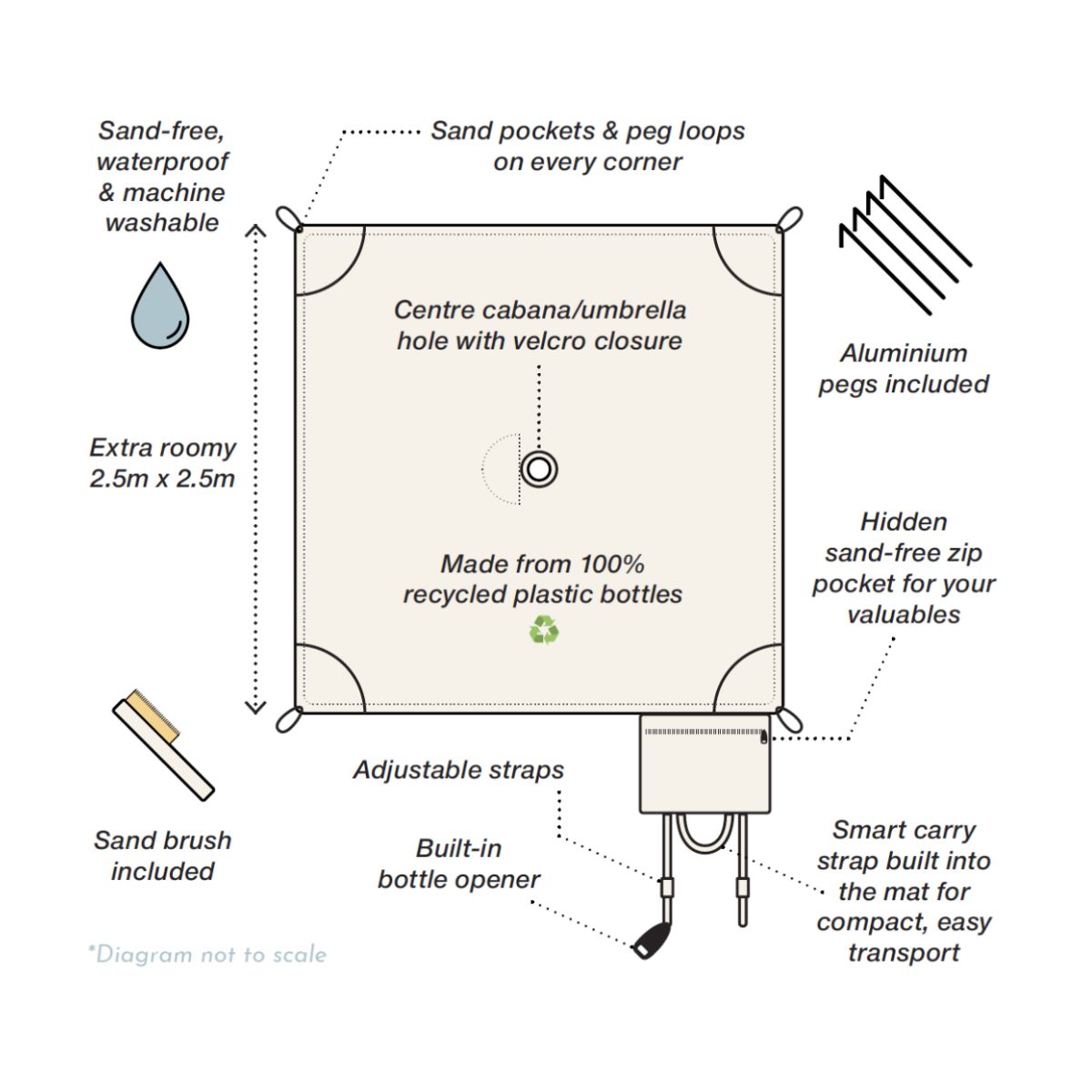 So we started hacking together ideas. A pocket that actually keeps your valuables sand-free — hidden underneath, where your keys can’t go walkabout and your phone stays grit-free. Sand pockets and pegs for the windy days — because who says you can’t have both?